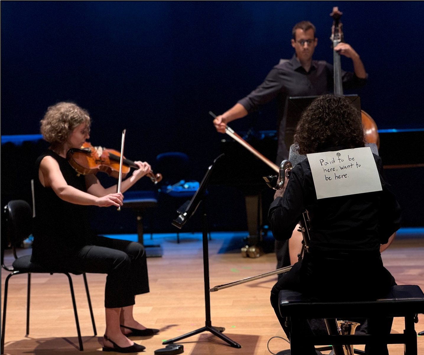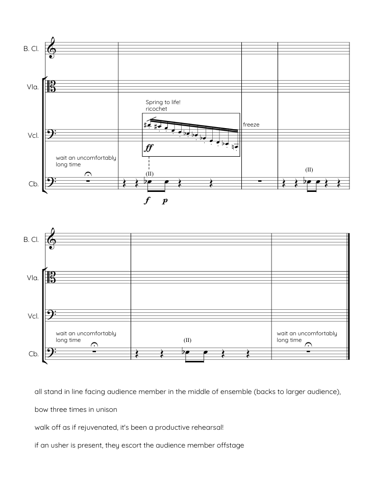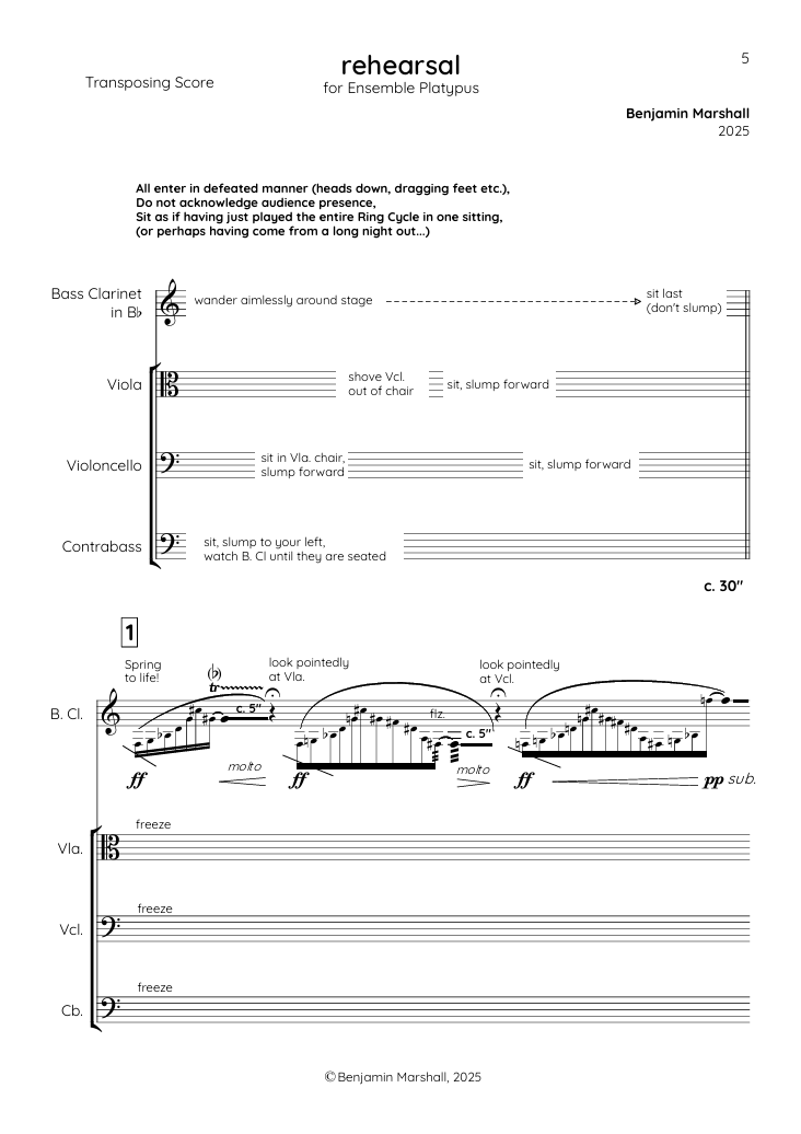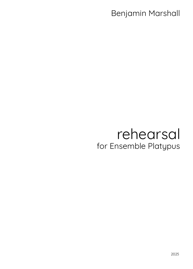 Written for Ensemble Platypus, rehearsal is a work for bass clarinet, viola, cello and double bass. The work was premiered in 2025 as part of the new music festival Sounds of Now Vienna 2025. The composition plays with the space between rehearsal and performance, drawing upon my personal experiences both in and observing rehearsals and the different interactions that occur between musicians.