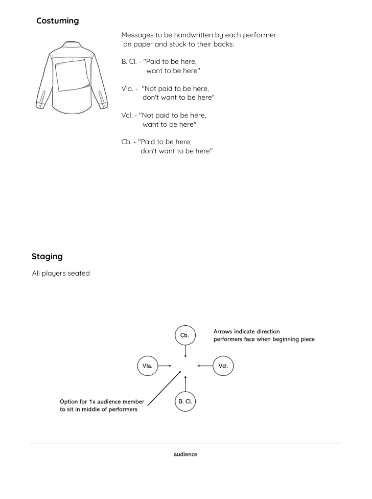 The choice of instrumentation evolved in dialogue with the ensemble, who desired a work for a subset of their full instrumentation (which would add violin and piano). The composition features the use of specific costumes and stage settings, with the opportunity for a singular audience member to be seated on the floor in the middle of the ensemble itself. This is the optimum position to experience the sonic elements of the work, but not the theatrical as the audience member has to rotate their head in order to flick between different members of the ensemble itself, never experiencing the ‘full view’ that the rest of the conventionally seated audience are experiencing.